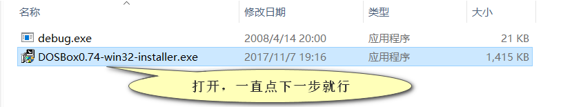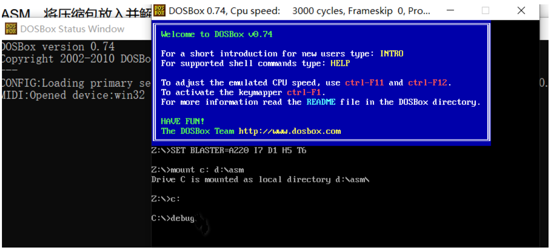 双击打开3、输入指令mount c: d:\asm(其实就是路径),回车-----》输入c:回车----》打上debug就可以使用了