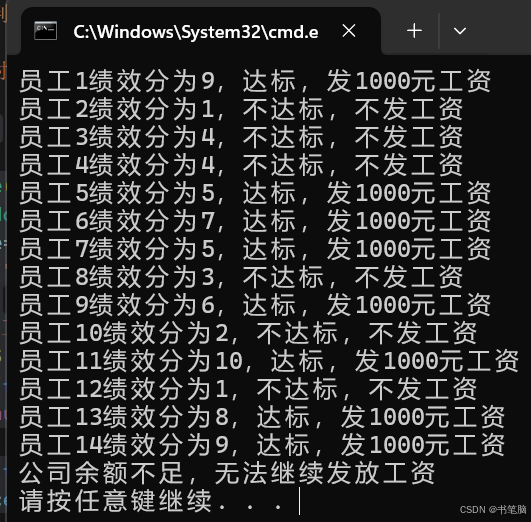 - 领工资时,财务判断员工的绩效分(1-10)(随机生成),如果低于5,不发工资,换下一位