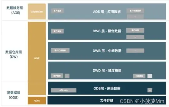 每个公司的业务都可以根据自己的业务需求分层不同的层次;目前比较流行的数据分层:数据运营层、数据仓库层、数据服务层。