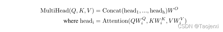 所谓Multi-Head就是“多头”实际上就是将上面所提到的Q,K,V矩阵进行分块。相比于对整个Q,K,V做一个attention,用不同学习到的映射分别映射h次是更有益的。并行执行attention之后将输出拼接起来,再做一个映射即可。公式如下: