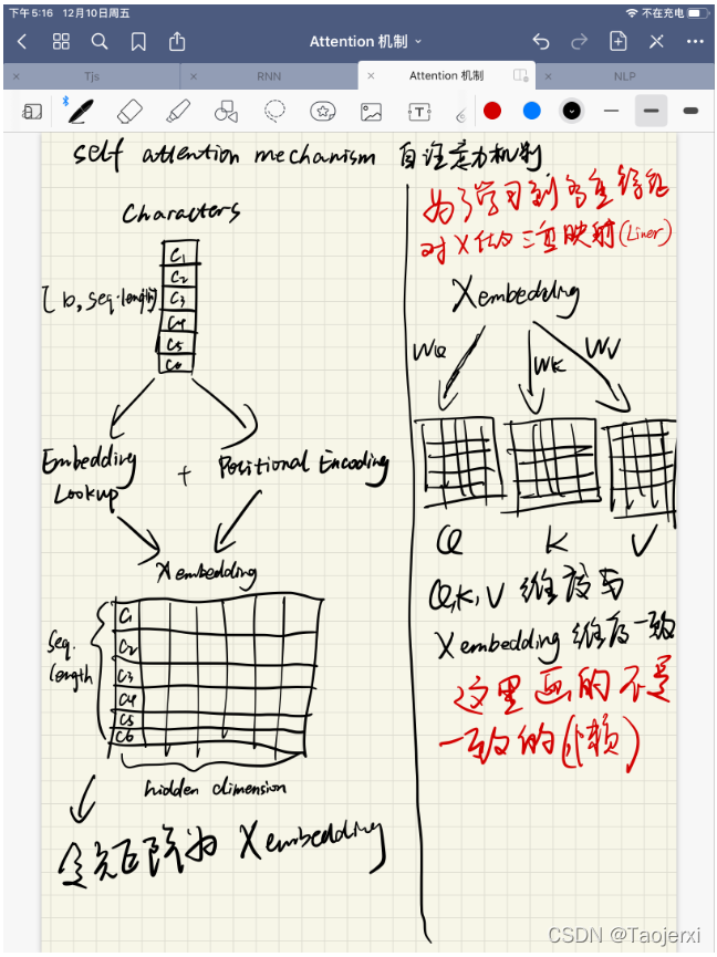 首先对输入的句子做一个Embedding和Positional Encoding(这里的c1,c2......表示一个句子中的词),将二者相加得到最终的X_embedding矩阵,维度是[seg_length , hidden_dim],里面存储的是输入sequence的特征信息,为了更好的学习到X_embedding中的特征,对X_embedding做了三个不同的映射,得到Q,K,V维度与X_embedding一致,之后根据超参数h将Q,K,V分为h个小矩阵,每个矩阵中都包含了每个字的一段特征,作点积后,生成注意力矩阵,如上图所示cick表示第i个字与第k个字之间的相关程度,数值越高,代表相关度越高。对注意力矩阵作softmax代表着某个字与其他字之间的相关度和为1。之后与V进行点积,如图,每一个元素都包含了当前字向量与句子中其他字向量的信息。最后将不同的head拼接起来再进行映射,Softmax输出即可。结构中包含的Add其实是残差连接,目的是防止梯度弥散,Norm是标准化,Feed-Forward前馈网络实际上是Linear->Activate(Relu)->Linear这样的一个结构。到此,Transformer的结构就梳理完毕。