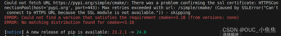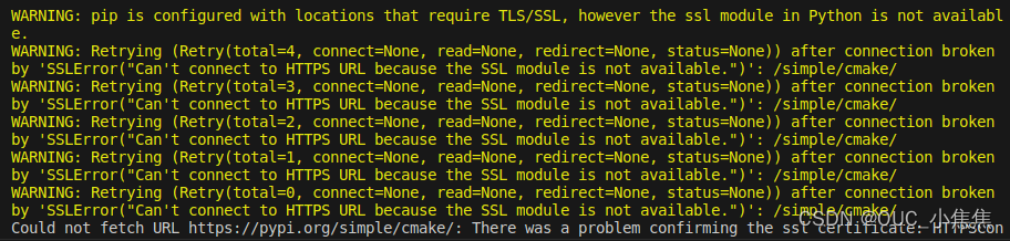 由于在如上的截图中所示,cmake版本不符合需求,因此需要先升级cmake版本。具体的升级方案可参考:http://t.csdnimg.cn/VavEq,按照博主的描述安装完成后,将不会再报红色字体的error,但是黄色字体的warning(SSLerror)依然存在。