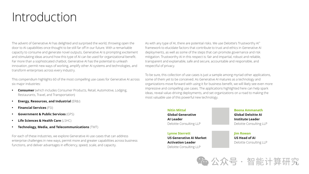 这是一份生成式 AI 应用案例汇编,深入剖析消费品、金融等六大行业 60 个高影响力用例。从文本、代码等六种产出模态,及成本削减、创新等六个价值捕获维度分析。每个案例阐述商业问题、AI 作用、潜在收益,强调风险管理与信任建立,以德勤 “值得信赖的 AI” 框架从公平、安全等角度审慎评估。报告预计 2025 年 25% 使用生成式 AI 的公司将试点 Agentic AI,2027 年比例升至 50% 。它为各组织揭示生成式 AI 价值部署方式,激发创新思路,助力企业明智决策,推动生成式 AI 在各行业合理应用与发展。