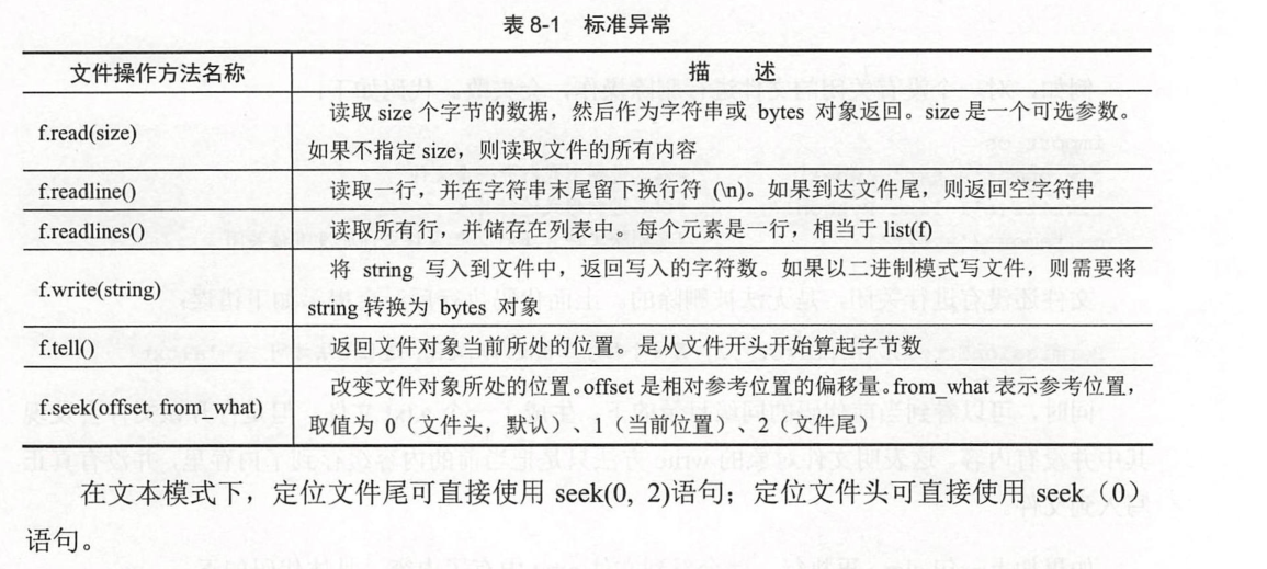 f.close():在文本文件中 (那些打开文件的模式下没有 b 的), 只会相对于文件起始位置进行定位。