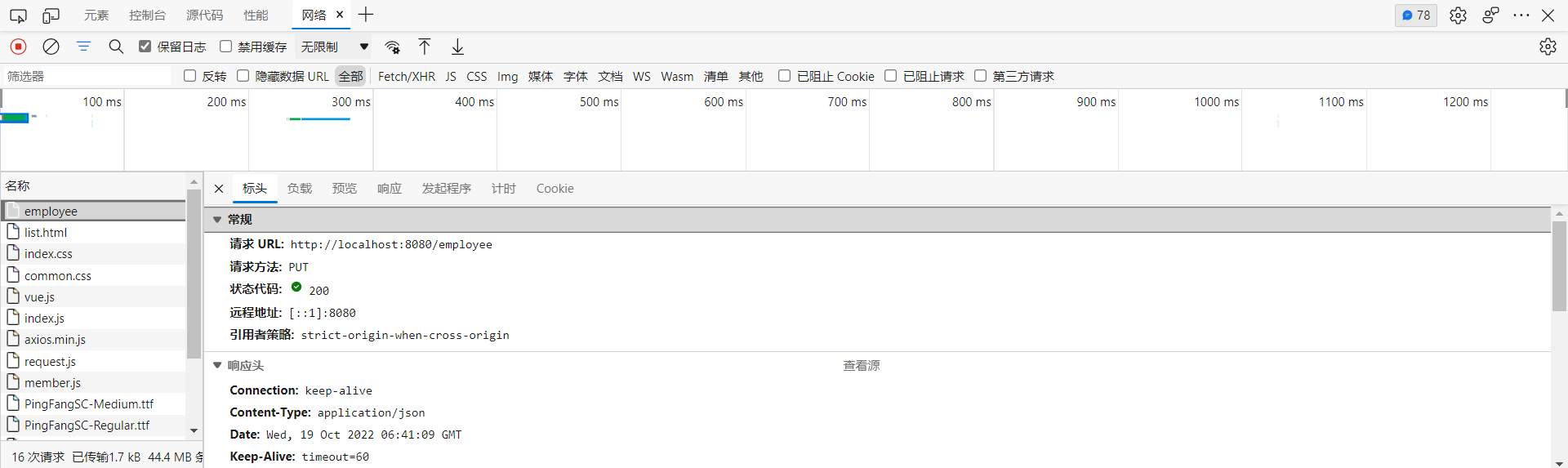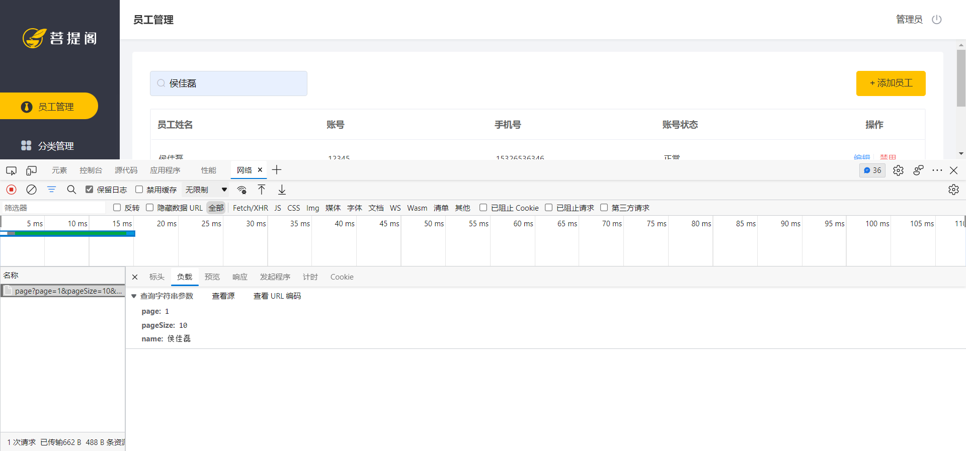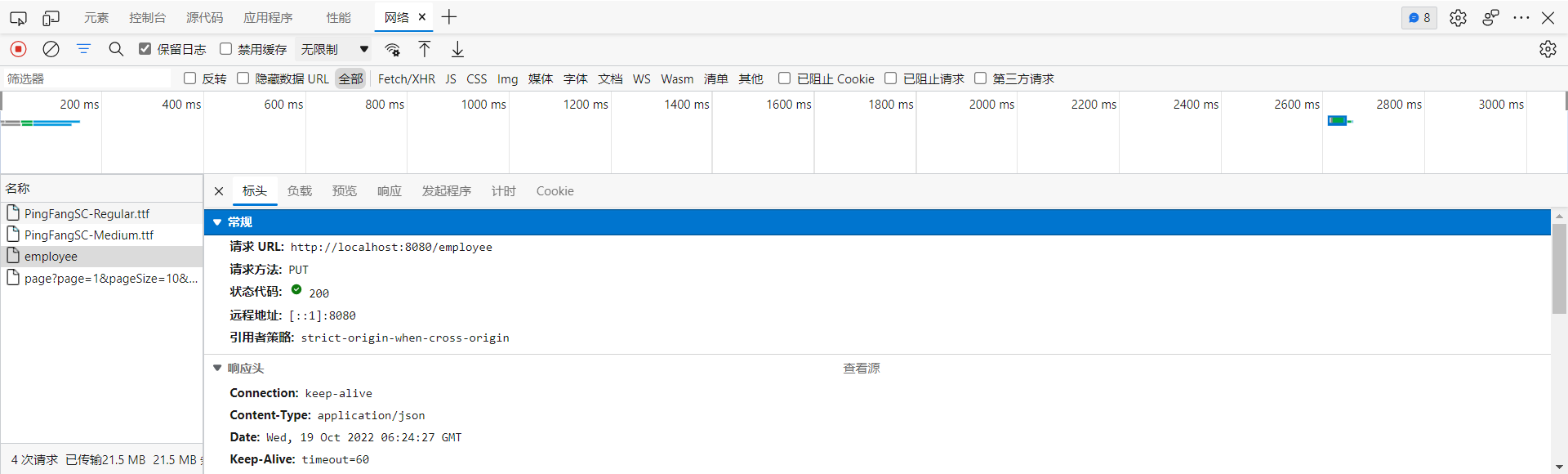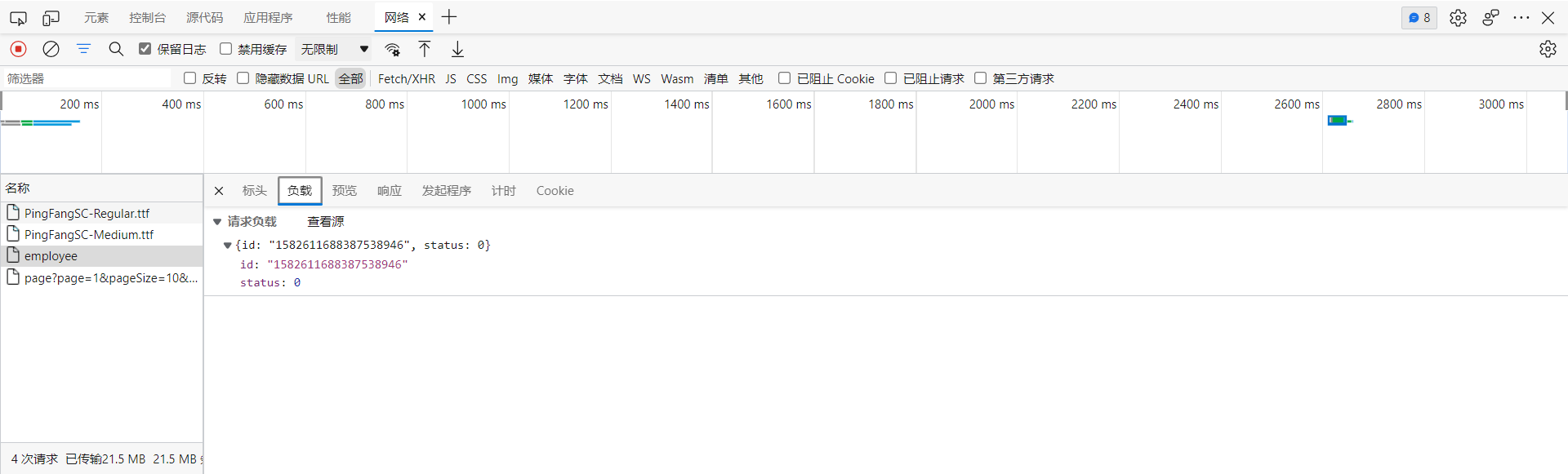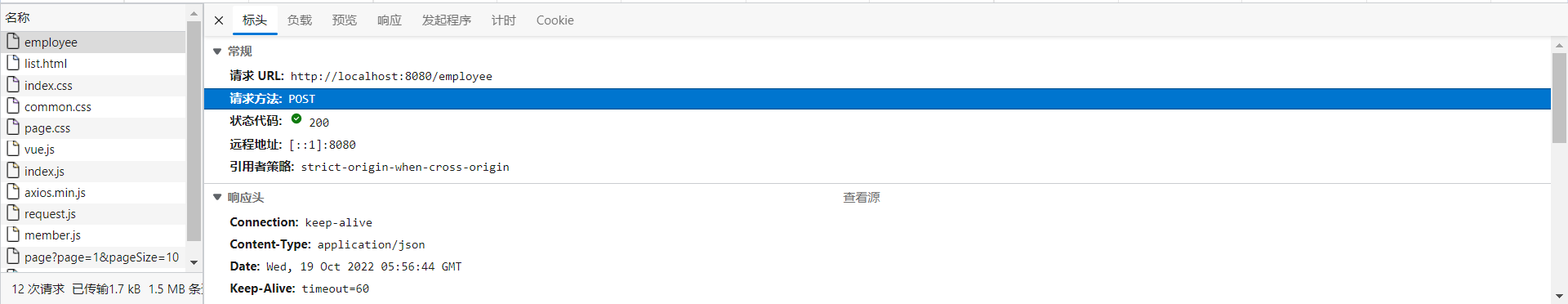 我们打开F12,输入数据点击保存后查看数据的请求方式(点击负载,可以查看到填写信息的Employee内容,这里不再展示):