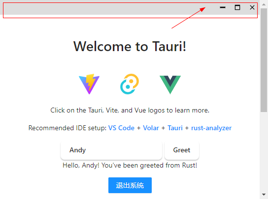 此时在需要拖动元素上加一个 data-tauri-drag-region 属性,即可实现自定义区域拖动窗口功能。这个功能有些类似 electron 中自定义拖拽 -webkit-app-region: drag