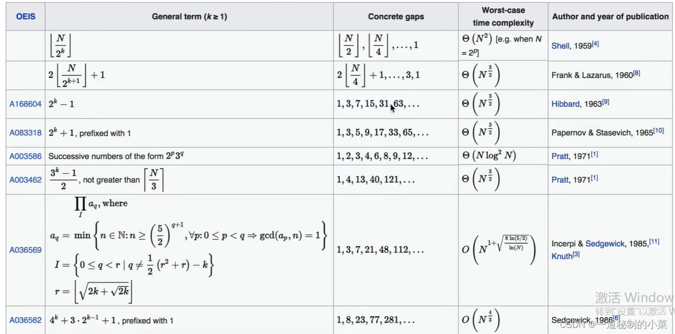 如上图所示,选取不同的gap序列时希尔排序具有不同的时间复杂度,且存在一些复杂的gap序列使得无法计算其复杂度,但总的来说,希尔排序的时间复杂度比基础排序快,比进阶排序慢。