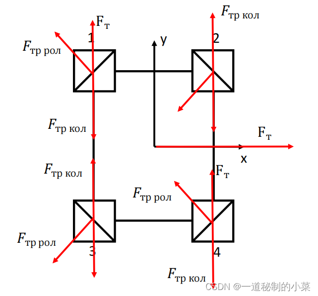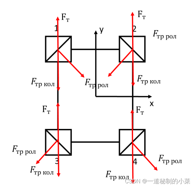 为了推导轮子扭矩与机器人速度之间的关系,我们推导了移动小车沿 X 轴和 Y 轴移动时的广义牵引力的公式。