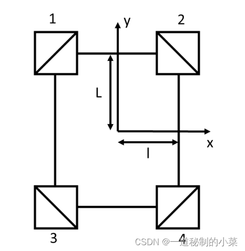 由上述文献我们得到下面的公式,该公式可以推导任何矩形多轮全方位平台的运动学模型
