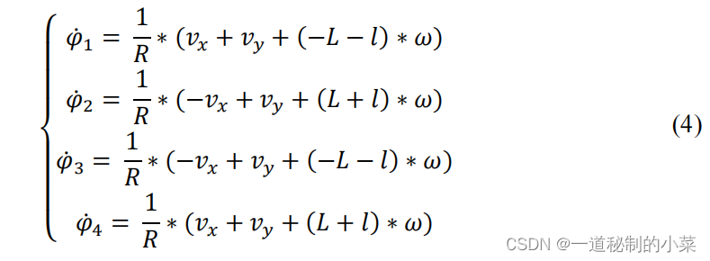 将上述数值代入公式 (3),我们可以得到由每个车轮的角速度组成的方程组 (4)。