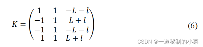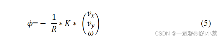 让我们将得到的方程以矩阵形式写成 (5),其中 K 是系数矩阵,行是系统 (4) 中每个车轮的系数,列是相应的速度𝑣𝑥、𝑣𝑦 和 𝜔。