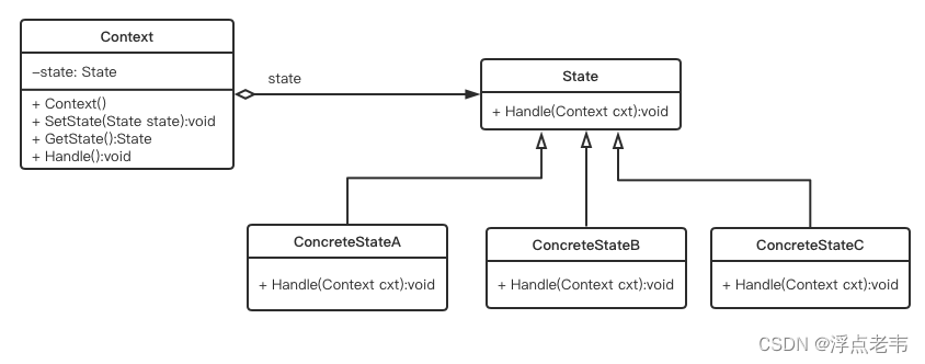 - Context定义客户感兴趣的接口(比如在main函数中调用);它的属性是一个State子类实例,定义当前状态。