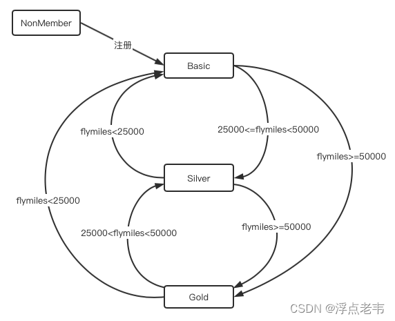 【例2】某航空公司的会员积分系统将其会员划分为:普卡 (Basic) 、银卡(Silver)和金卡 (Gold)三个等级。非会员 (NonMember)可以申请成为普卡会员。会员的等级根据其一年内累积的里程数进行调整。描述会员等级调整的状态图如下图所示 。