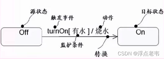比如,水壶开关关闭,想要烧水,首先触发开关打开这个事件,监护条件是满足水壶有水且水壶通电,如果都满足就执行烧水动作,水壶就转换成打开的状态。如下图所示: