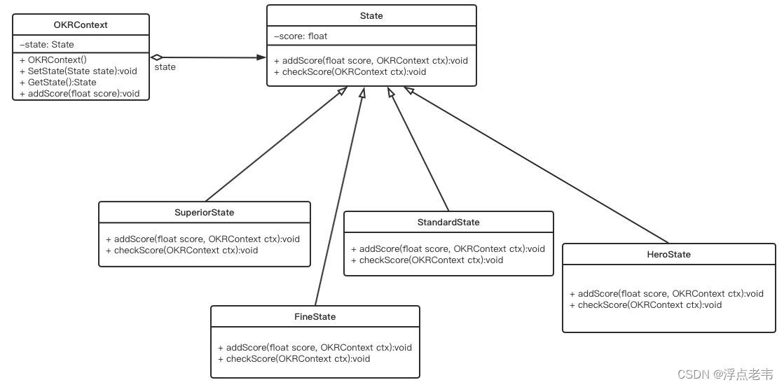 现在抽象出一个抽象状态类(State)并定义了检查分数范围、计算分数等方法,然后为上图的每个状态设计一个具体的状态类,它们是优秀(SuperiorState)、良好(FineState)、合格(StandardState)、背锅(HeroState)4种状态。环境类MachineContext定义一个State实例,初始化为背锅(HeroState),并提供状态转换触发的方法。根据分析可以得到如下图所示的状态模式结构图。