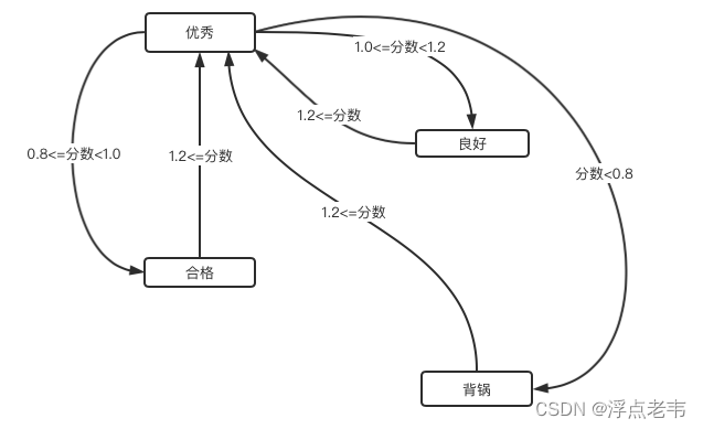 根据描述得到OKR的优秀到其他状态相互转换的状态图如下图所示。