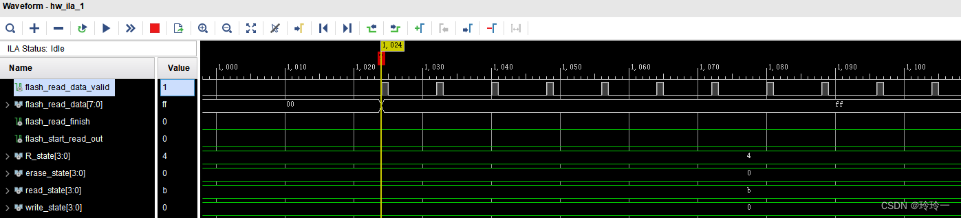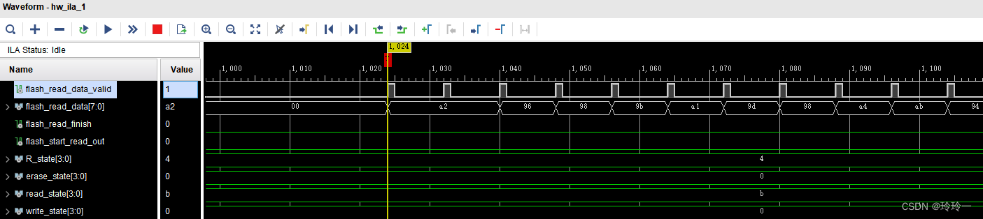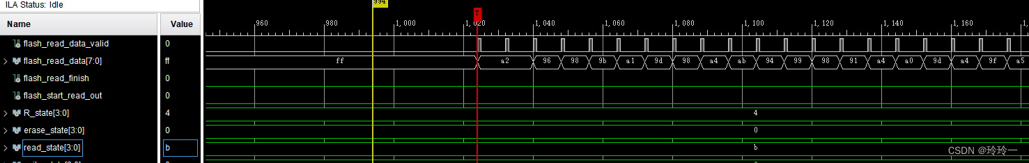 发送指令将读地址设置为200000h,收到反回指令后发送指令a将读深度设置为50000h,收到反回指令后将lia抓取flash_read_data_valid==1,并发送指令启动读操作,ila抓取flash读出的数据如下图所示。