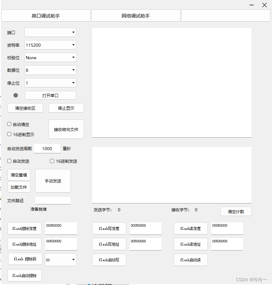 FPGA上电后,按下复位按钮,状态机跳入FLASH_INITIAL_DONE状态,此时flash初始化工作完成,可以通过串口上位机发送flash控制指令。串口上位机如下图所示。