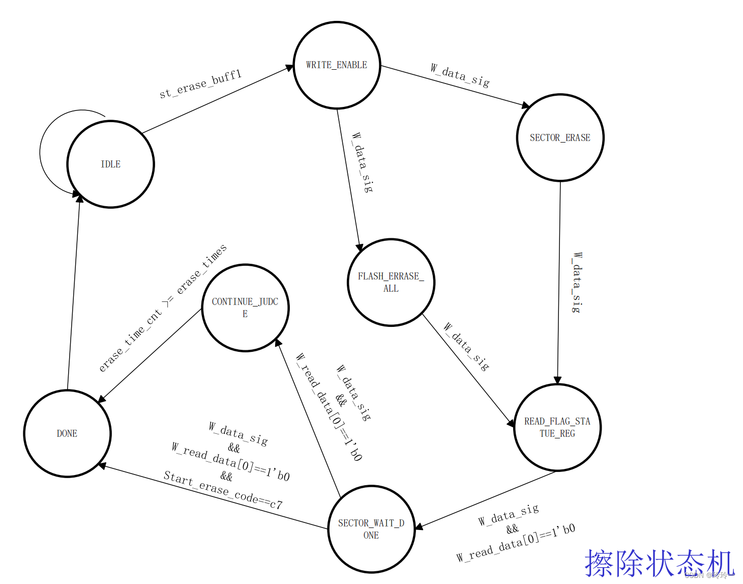 擦除状态机设计图如下所示,用户发送启动擦除脉冲(start_erase)后,控制器打开写使能,并根据用户指定的擦除码(start_erase_code)进行判断,对用户设定的擦除深度(start_erase_length)经行切分,如果擦除码20h,那么擦除深度需要为4096的整数倍,如果擦除码为d8h,那么擦除深度需要为65536的整数倍。
