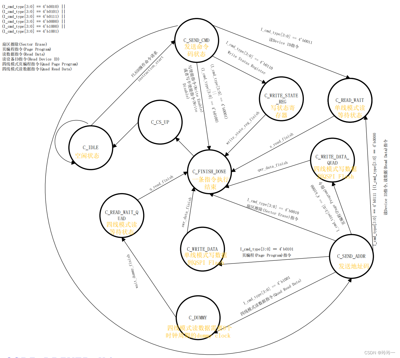 驱动层状态机设计图如下所示,指令层给每种类型的指令设置一个指令类型R_cmd_type_reg,驱动层根据指令类型的低四位判断该条指令发送完8bit指令码后是否需要接着发送地址位以及是否紧接着读取数据。指令码类型如下: