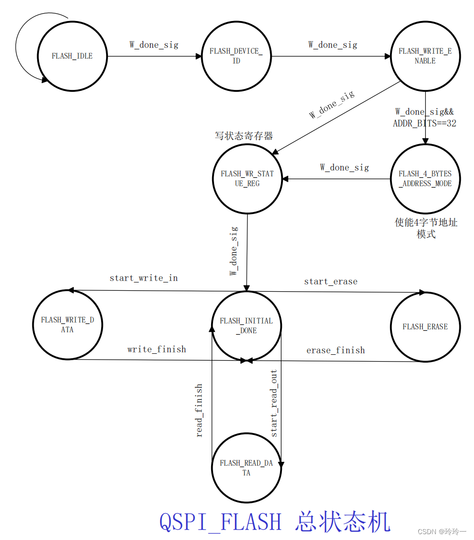 顶层模块靠一个主状态机控制,如下图所示,复位放开后先读取flash设备ID号,复位写使能,启动写使能,根据地址位宽配置选择要不要进入四字节地址模式,最后将R_status_reg值02h写入状态寄存器,关闭flash所有扇区的硬件保护。最后进入初始化完成状态等待读写擦启动脉冲信号。