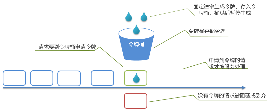 请求进入后,必须先尝试从桶中获取令牌,获取到令牌后才可以被处理