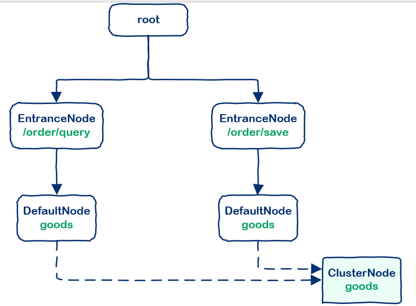 DefaultNode:代表链路树中的每一个资源,一个资源出现在不同链路中时,会创建不同的DefaultNode节点。而树的入口节点叫EntranceNode,是一种特殊的DefaultNode