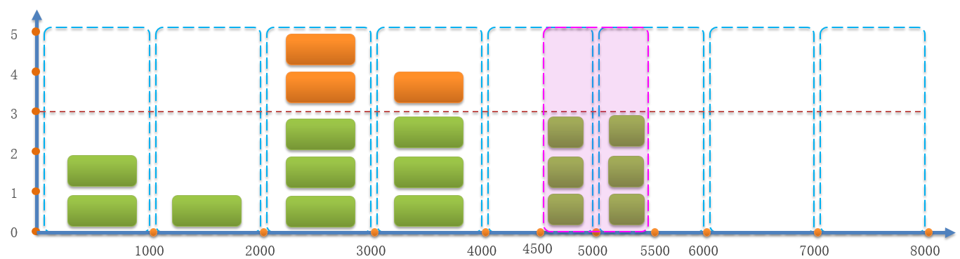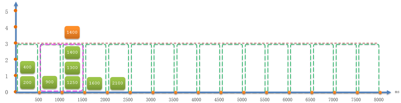 窗口时间跨度Interval为1秒;区间数量 n = 2 ,则每个小区间时间跨度为500ms