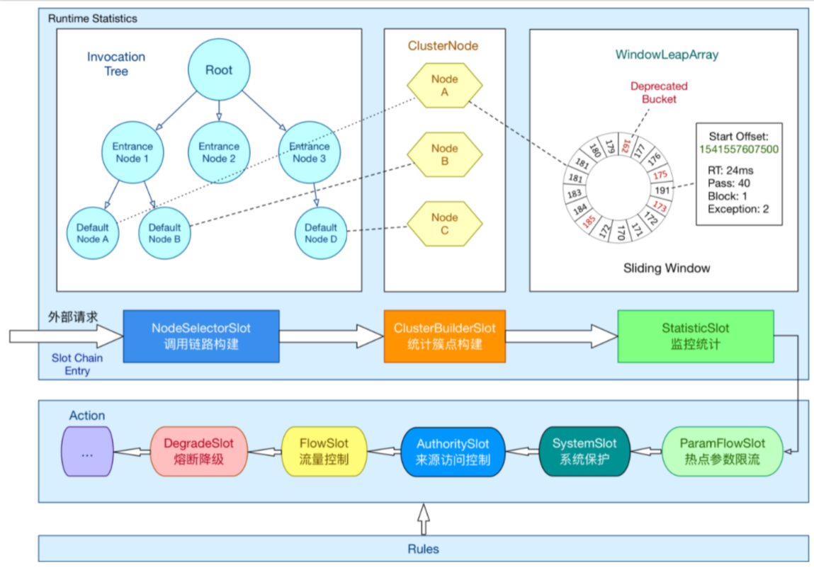 StatisticSlot:负责统计实时调用数据,包括运行信息、来源信息等