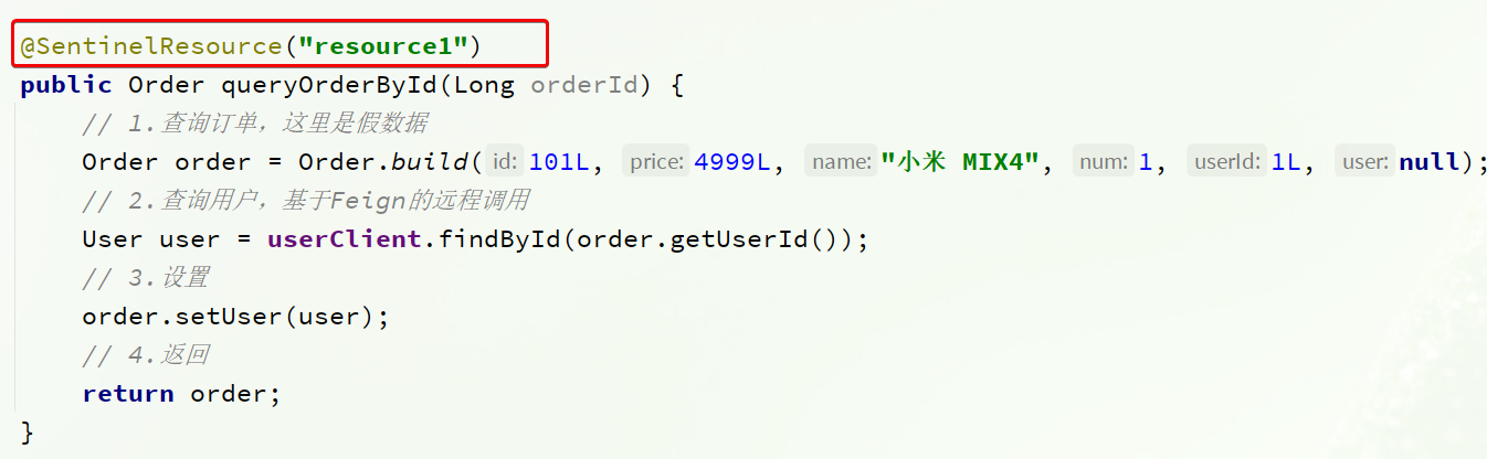 例如,我们在order-service服务中,将`OrderService`的`queryOrderById()`方法标记为一个资源。