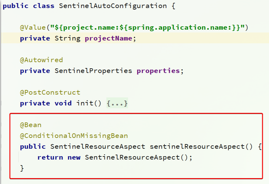 可以看到,在这里声明了一个Bean,`SentinelResourceAspect`: