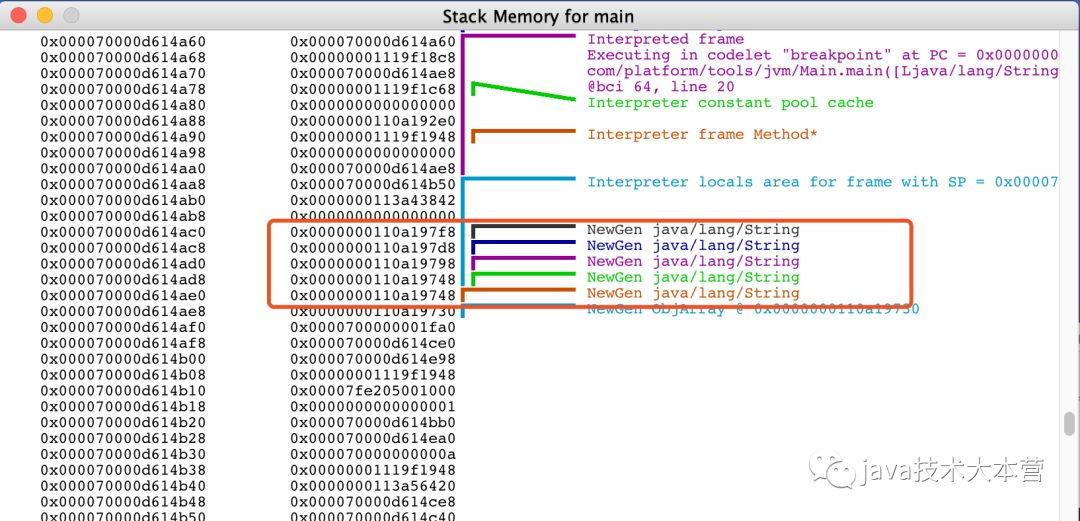 testObject实例存着s这个字符串的地址引用. s里面存着'java技术大本营'的byte的引用.s 在字符串常量池中.