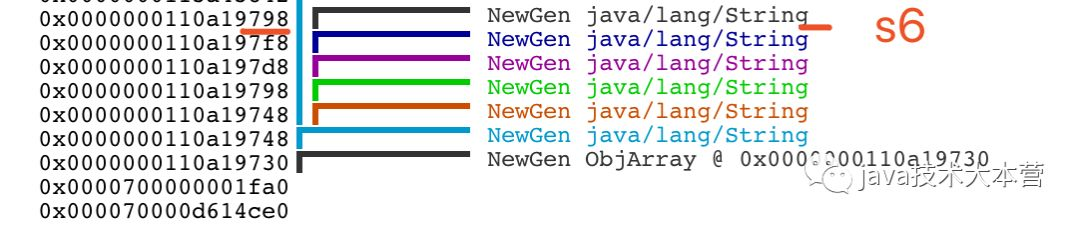 可以看到在原来的基础上,新增了一个s6,地址是798. 就和我们上面的第三条的地址是一样的了. 也就是执行了intern()之后, 会看常量池有没有, 有就返回常量池的地址引用.