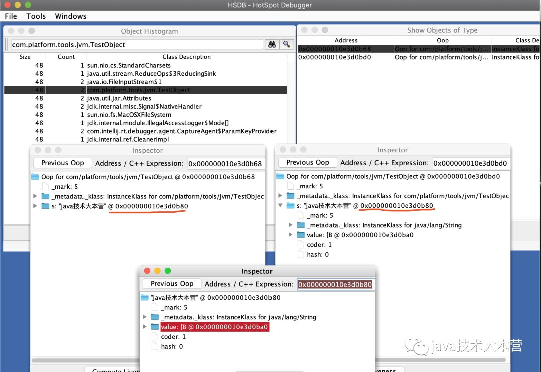 如上代码所示,在运行到System.out.println(t1)时,堆里应该有两个TestObject实例.然后我们需要看这两个实例中的s是不是都指向同一个位置, 打开HSDB可看到如下信息: