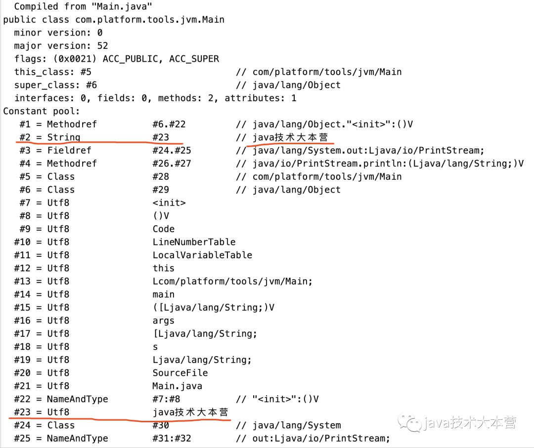 如上图画线部分的Constant pool,就是静态常量池/class常量池, 在下面的内容中, 我们可以看到, 和我们需要找的java技术大本营来对比,有两行是相关的
