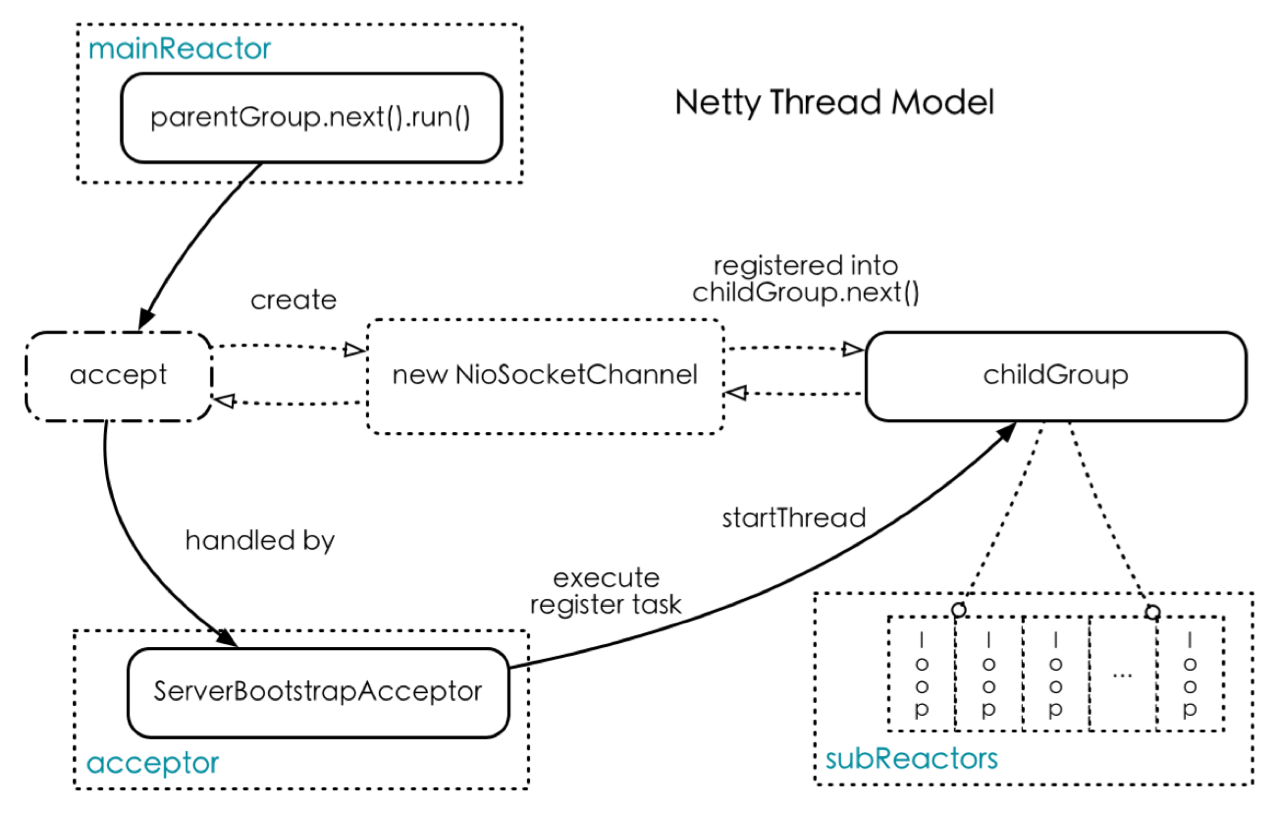 EventLoopGroup:Netty的Reactor线程池,负责维护一组EventLoop的调度工作,通常是bossEventLoop用来维护连接,subEventLoop来维护所有已注册的Channel的I/O操作处理用户自定义的Task和定时任务的Task