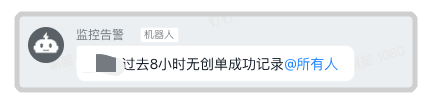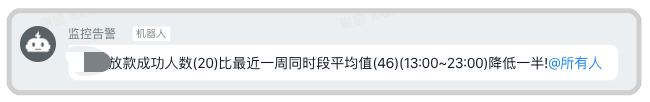 当然上文也说了,每个资金方授信成功或借款成功的总数很可能在几十分钟内都为 0,那我们可以以小时的成功总数来告警。我们记录下每天每小时的成功总数,每半小时比较今天和过去一周同一时间段(平均值)近 X 小时内的成功数,如果低于过去一周平均成功数的一半,说明可能链路出问题了,就告警,这个 X 怎么选择呢,如果最近一小时成功总数小于 20(这个阈值需要根据实际情况选取),那我们就选今天和过去一周同一时间段最近两小时的成功总数进行比较,如果还是小于 20 ,那就选最近三小时的成功总数进行比较。。。,直到最近 X 小时的成功总数达到 20,这样误差就比较小了,通过这种方式的告警有效率目前为止 100%! 也发现了线上多起问题,钉钉告警展示如下: