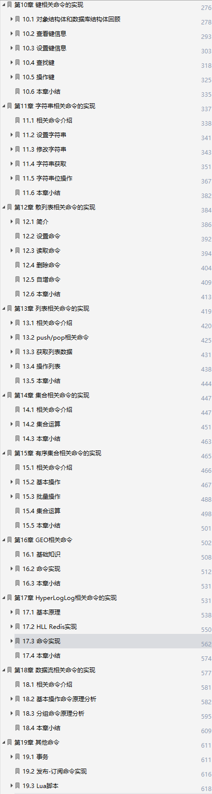 第10~19章,分别讲解了键、字符串、散列表、链表、集合、有序集合、GEO、HyperLog和数据流相关命令的实现。