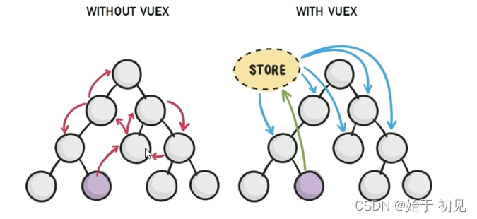 第二幅图,使用vuex,创建一个全局共享的store,就不需要一个个传递了,可以直接将数据放到store里面