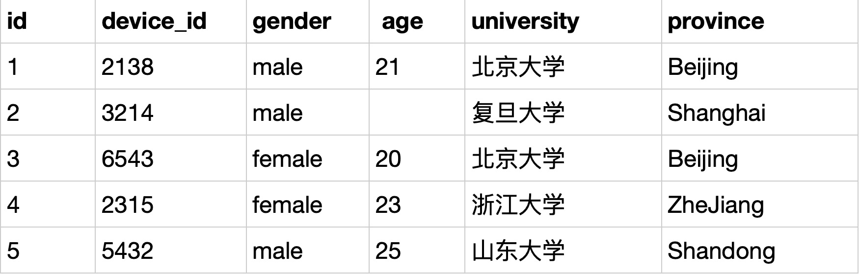 现在运营只需要查看前2个用户明细设备ID数据,请你从用户信息表 user_profile 中取出相应结果。