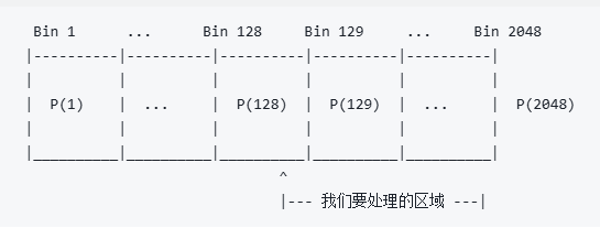 原始数组有2048个bin,目标128个bin,我们的目标是找到一个最佳的“截断点”,把2048个bin用128个bin来表示(量化),同时是的信息损失最小。结合上面的三个案例的逻辑,在2048个bin中,首先前0-127个bin不做改变,128的位置开始,向右遍历所有可能得截断点,直到2048,同时对于每一个截断点,都会计算一次KL散度。