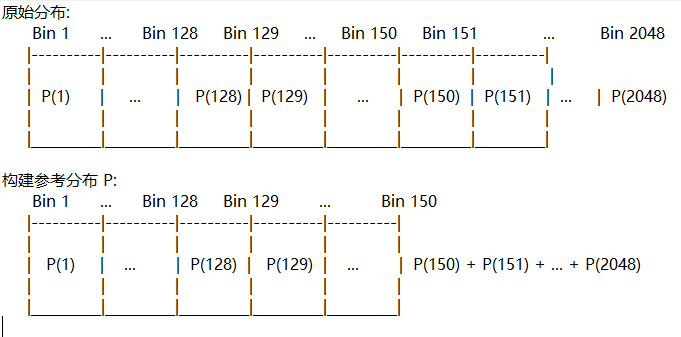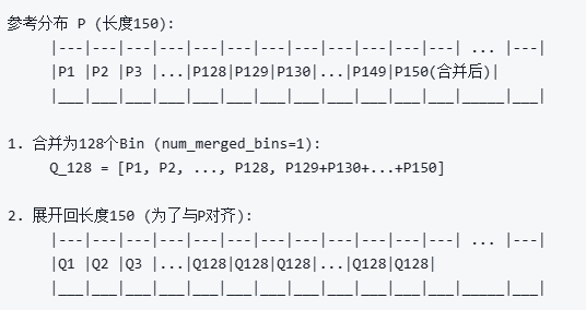 num_merged_bins = threshold // target_bin。例如,如果threshold=150,num_merged_bins = 150 // 128 = 1(不能整除)。 - 合并Bin:将分布