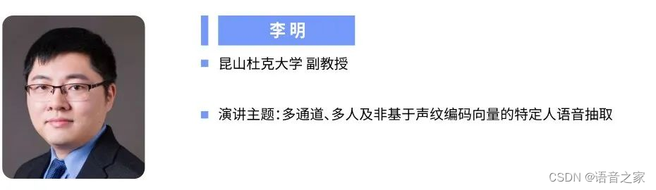 李明分享的主题是《多通道、多人及非基于声纹编码向量的特定人语音抽取》。首先介绍了不直接使用声纹编码向量作为目标人先验信息的特定人语音抽取模型设计,其次在多人同步抽取及多通道语音输入这两个方面介绍团队最近的一些研究成果。