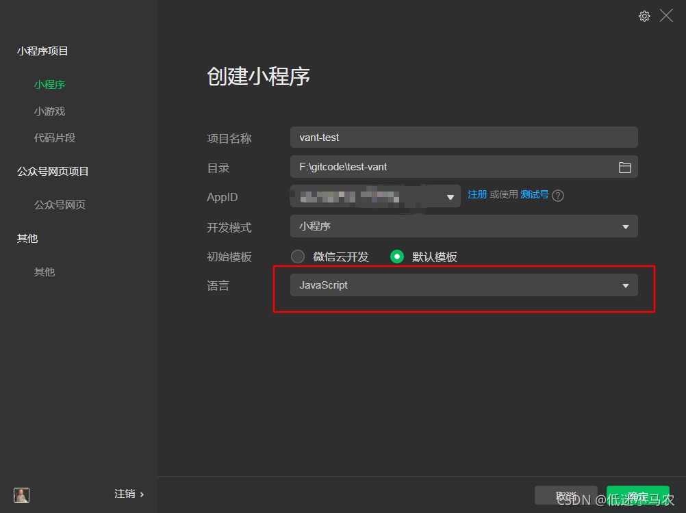 1、首先在微信开发者工具创建小程序(语言类型为javascript的情况、不是云开发)