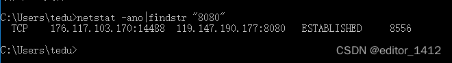 在命令框中输入 [netstat-ano|findstr "端口"],即 :netstat -ano|findstr "8080"