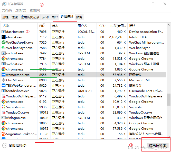 打开任务管理器,点击详细信息,查看PID,找到8556的端口,结束任务即可。