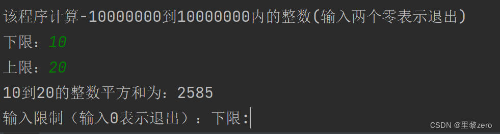 该C语言程序在指定范围内(-10000000到10000000)计算整数的平方和,同时验证用户输入的范围是否合法。用户可以连续输入不同范围进行计算,直到输入0为止。