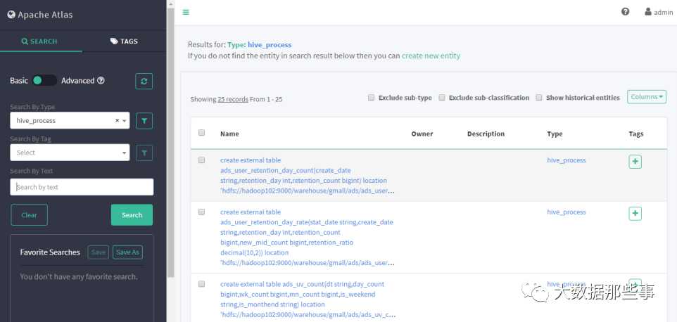 [root@hadoop101 conf]# pwd/opt/module/atlas/conf[root@hadoop101 conf]#cp atlas-application.properties /opt/module/apache-atlas-hive-hook-2.0.0/hook[root@hadoop101 conf]# cd /opt/module/apache-atlas-hive-hook-2.0.0/[root@hadoop101 apache-atlas-hive-hook-2.0.0]# cd hook-bin/[root@hadoop101 hook-bin]# ./import-hive.sh输入用户名:admin;输入密码:adminEnter username for atlas :- adminEnter password for atlas :-Hive Meta Data import was successful!!!