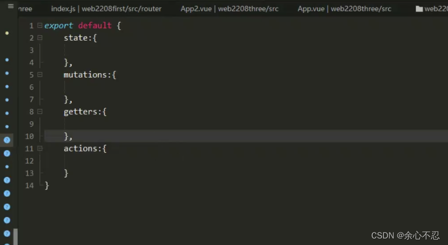 并在store中的index.js中引入该文件,可以将之前写的其他内容全部删除,指保留一个modules,里面是创建的文件引入的名字。