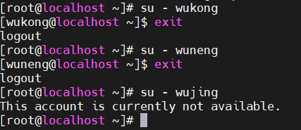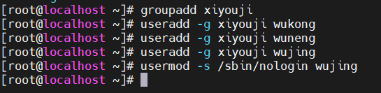 1、新建几个普通用户wukong,wuneng,wujing,他们都属于xiyouji组的成员,其中wujing没有和系统交互的shell。